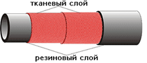 Конструкцию рукава составляет внутренний резиновый слой, один или несколько слоев текстильного каркаса и наружный резиновый слой. Наружная поверхность рукава имеет след от обмоточной ткани.