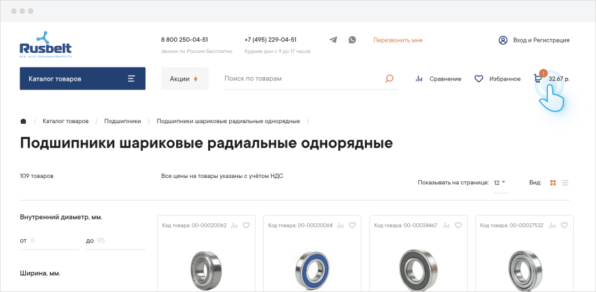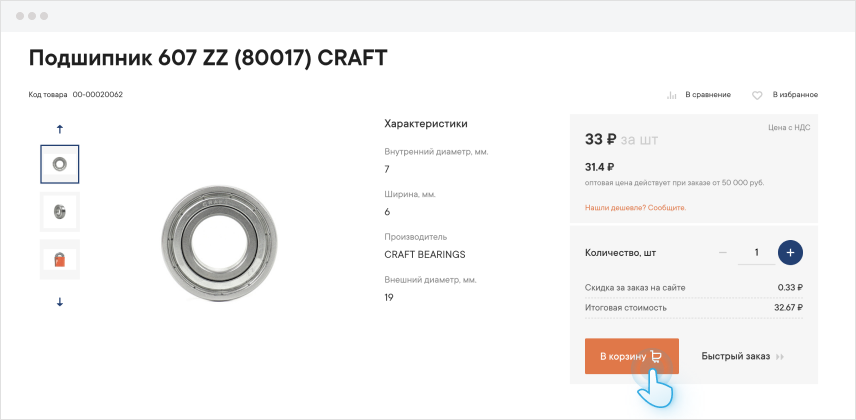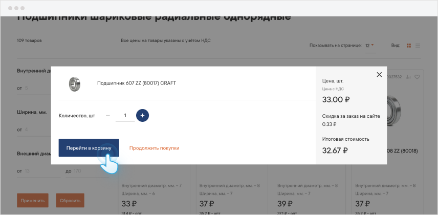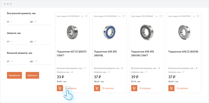 Чтобы добавить товар в корзину нажмите кнопку с изображением тележки на странице с каталогом или в карточке товара.