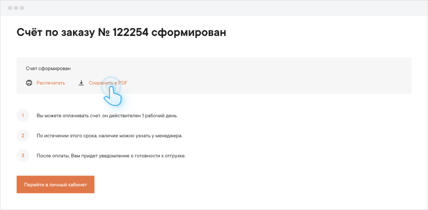 После оформления заказа Вы перейдете на страницу, где можно распечатать или сохранить счет после его загрузки. Загрузка счета занимает 60 секунд.
